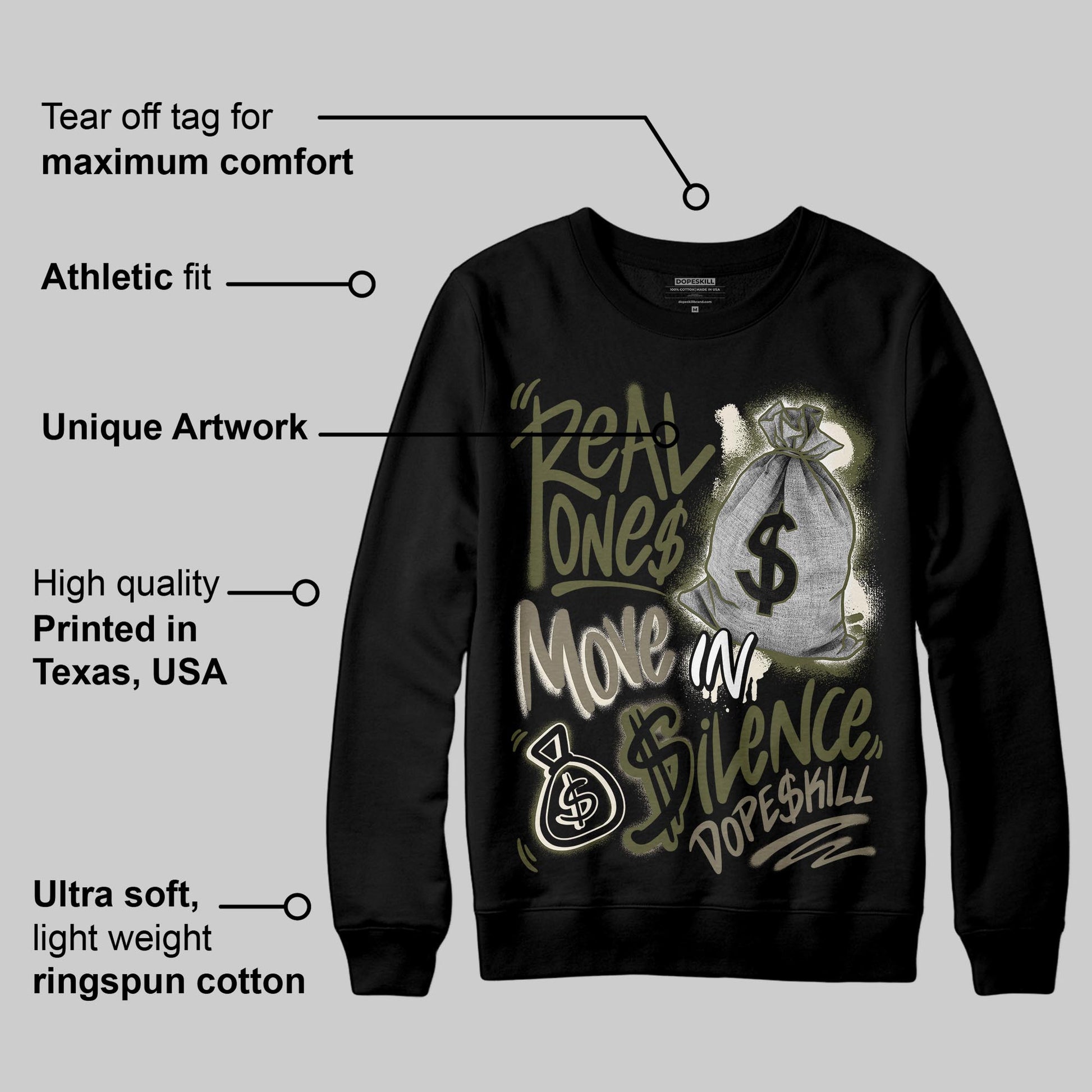 Medium Olive 3s DopeSkill Sweatshirt Real Ones Move In Silence Graphic