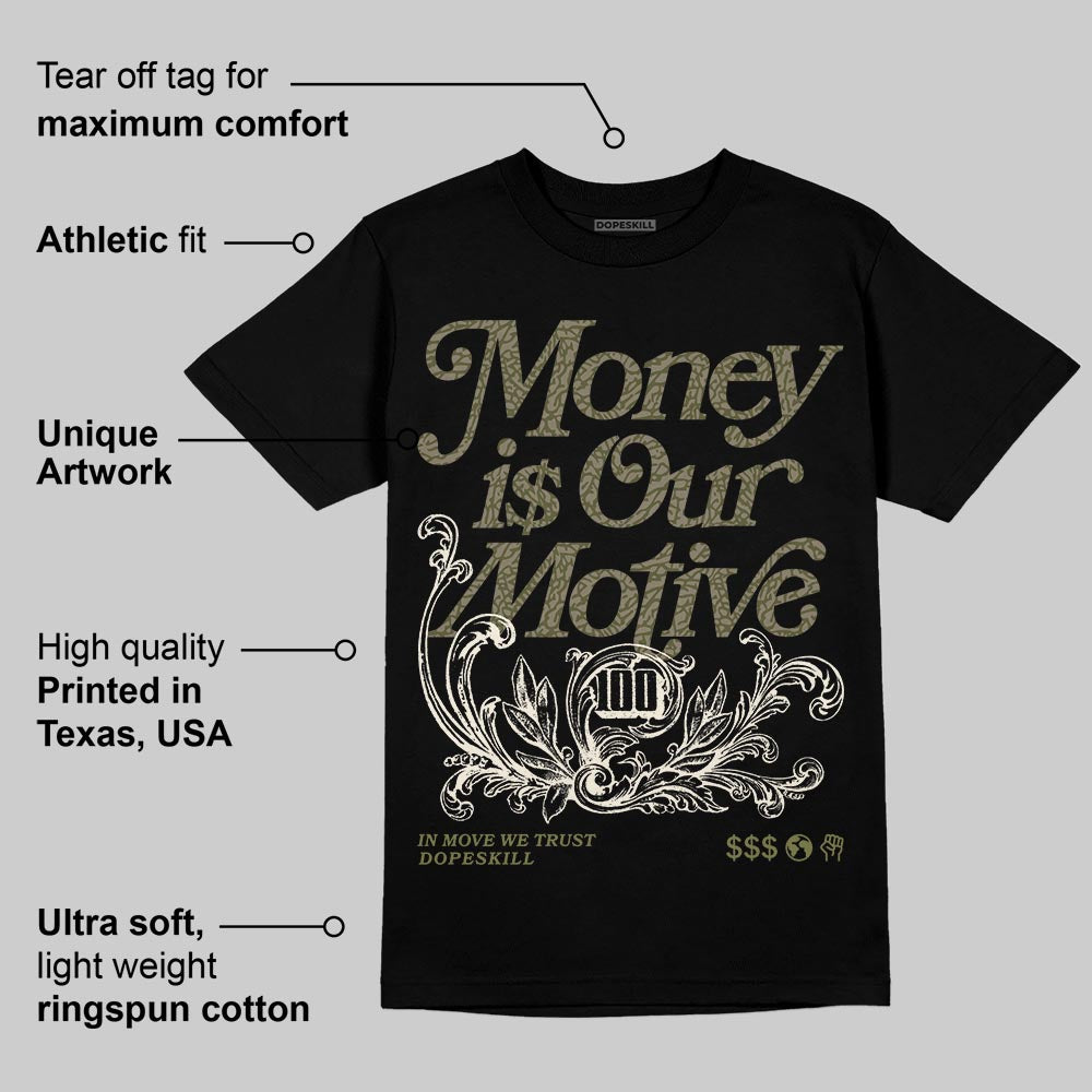 Medium Olive 3s DopeSkill T-Shirt Money Is Our Motive Typo Graphic