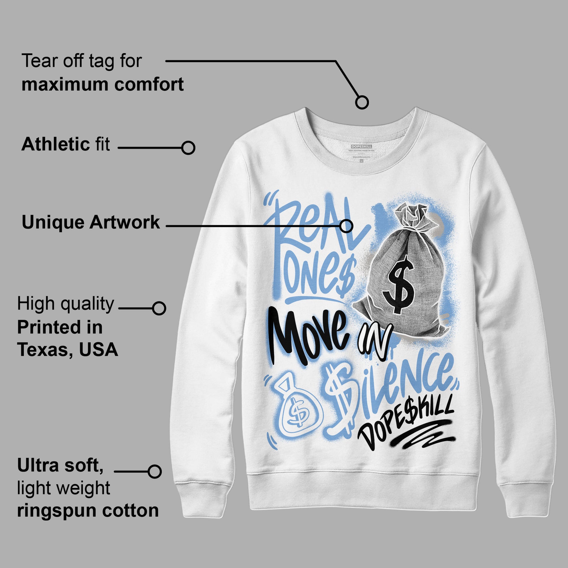 University Blue 5s DopeSkill Sweatshirt Real Ones Move In Silence Graphic